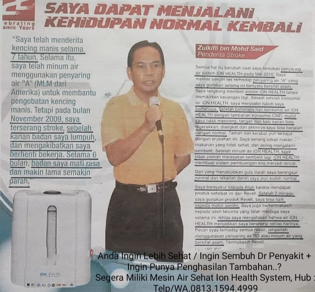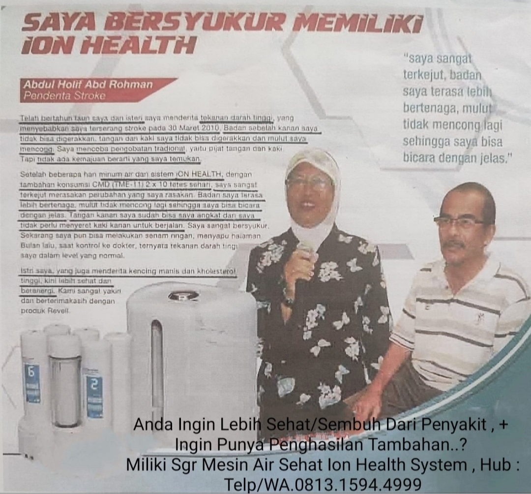 Berkhasiat / Manfaat Nyata Air Ion Health : - Mernormalkan Tekanan Darah - Menormalkan Diabetes -Melancarkan Sirkulasi Darah -Meninkatkan Stamina Tubuh - Membantu Menyembuhkan Mcm Mcn Penyakit - Nencegah Penyakit Degeratif -Melancarkan BAB & Membuat Nyenyak Tidur, Dsb Utk I nfo & Pemesanan, Silahkan Hubungi : WA. 0813.1594.4999Produk Lainnya
