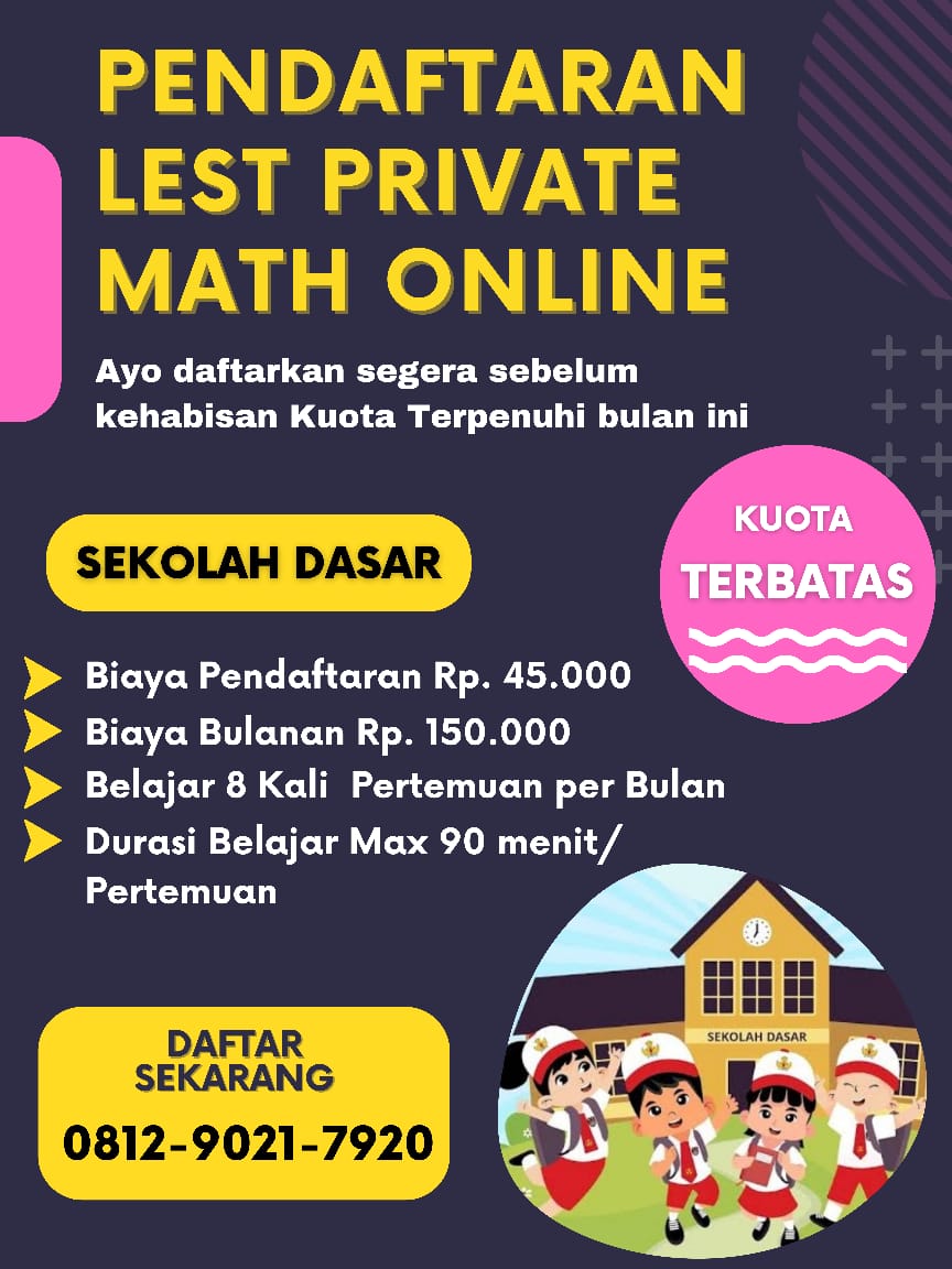 LEST PRIVATE MATH ONLINE Lembaga lest private kami menyediakan bimbel online mulai dari bimbel SD& bimbel SMP, bimbel kami mengajarkan mata pelajaran Matematika online, Bimbel kami menyediakan guru les yang bekualitas, Profesional terpercaya. SEHINGGA Belajar Matematika jadi Mudah dan Menyenangkan Bimbingan Belajar untuk SISWA yang KESULITAN Matematika. Guru Lest kami siap membantu setiap siswa secara personal sesuai dengan kebutuhan dan target belajar siswa. Bimbel Spesialis Matematika Terbaik di Indonesia Hanya untuk SD & SMP Metode Belajar Mengajar yang sudah terbukti berhasil karna Siswa Belajar langsung dari ahlinya! Guru kami spesialis di bidangnya dan telah melalui pelatihan serta bersertifikasi khusus. Belajar eksakta tanpa ribet! Konsep belajar tersistem yang memenuhi gaya belajar linier maupun global Fokus bantu raih target anda! Pendekatan personal sesuai kebutuhan dan target yang ingin dicapai siswa. Bimbel kami sudah terbukti berhasil meningkatkan nilai siswa, melalui pengalaman dan continuous improvement lebih dari 10 tahun. Kami Terima Pendaftaran Untuk Seluruh Indonesia Tunggu Apalagi Segera Daftar Sekarang Sebelum Kuota Terpenuhi Bulan iniProduk Lainnya